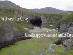 The caves reported here may have, at some point in the distant past, existed as side chambers within the main cave now represented by Smoo Cave. With the land ward retreat of the main cavern these now exist as separate shelters opening out from the cliff walls of the Geodha. It is likely that further cave systems exist in the vicinity, with passages perhaps extending underground for some considerable distance. Indeed, work on the third of the sites discussed here brought to light a partially collapsed passage at the rear of the cave. The first two caves, Glassknapper's Cave and Antler Cave, are immediate neighbours, and are situated in the western wall of the Geodha. It was the presence of deep archaeological deposits visible in an eroding section face, which extends across the mouth of both caves which prompted the present work. These deposits rise up from the rear of the present beach to a height of around 1.5m, but at some time in the past the cave floor would have been at the same level as the beach as it appears today, and in fact probably lower. These caves, like the parent cave, appear to have undergone considerable collapse through time, with fragments of Limestone visible within the eroding deposits. The third of the caves to be discussed here (Wetweather Cave) is located in the eastern wall of the Geodha, where it curves to the southwest to meet the entrance of Smoo Cave. The cave is situated at the juncture of a grass-covered slope, which may itself represent cave roof collapse, and the present cliff face, around 10m above sea level.