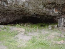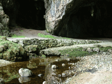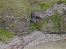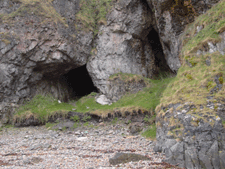 Smoo Cave lies at the inner end of a narrow inlet eroded into the Durness Limestone which is here lying almost horizontally. Smoo Cave contains a record of human occupation during several periods of historic and prehistoric time. The low soil-covered mound just inside the entrance was excavated in 1992 and proved to be a midden, that is, a domestic refuse heap. It was packed with shells, some of which can still be seen projecting up through the soil surface. The upper part of the midden was found to date from the Iron Age; deeper levels were progressively older. There is supporting evidence of a Mesolithic presence here, but it is only anecdotal. In 1972 Ian Keillor of Elgin spotted three probable Mesolithic implements, uncovered by erosion in the eastern bank of the burn. Unfortunately, he handed them over to a self-styled expert who took them away, supposedly for scientific testing. This person has not been heard of since. |